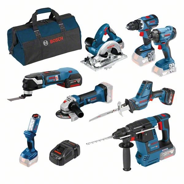 - Set professionnel : GSR 18V-60 C + GDR 18 V-200 C + GBH P 18V-26 + GWS 18-125 V-LI + GKS 18 V-LI + GSA 18 V-LI + GOP 18V-28 + GLI 18V-300 + GAL 1880 CV + 2 batteries 18 V 5,0 Ah + sac Ă outils