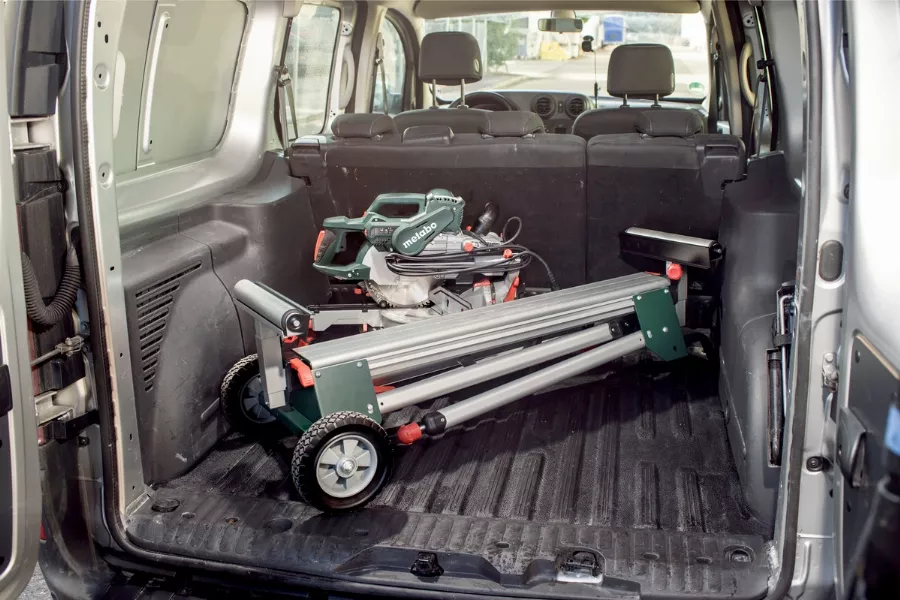 - Socle pour scie Ă onglets lĂ©ger et robuste avec fonction Trolley pour l’utilisation mobile avec mĂȘme avec la scie montĂ©e